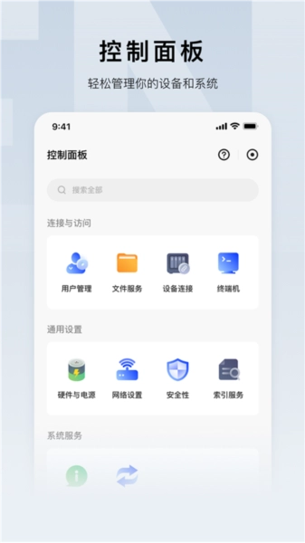 打开应用可在线存储管理个人文件数据、访问共享文件并集中管理,能在线预览照片、播放喜欢的影视,还能在控制面板中管理设备和系统。