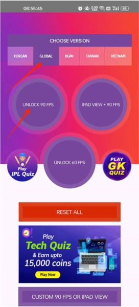 1、打开软件,选择全局模式global,再点击解锁90帧模式;