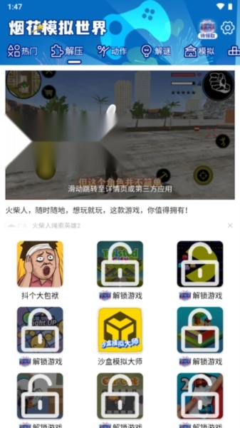 烟花模拟世界拥有丰富多样且涵盖多种游戏类型的游戏库,部分游戏需观看短小广告解锁,界面简洁易用、操作流畅。