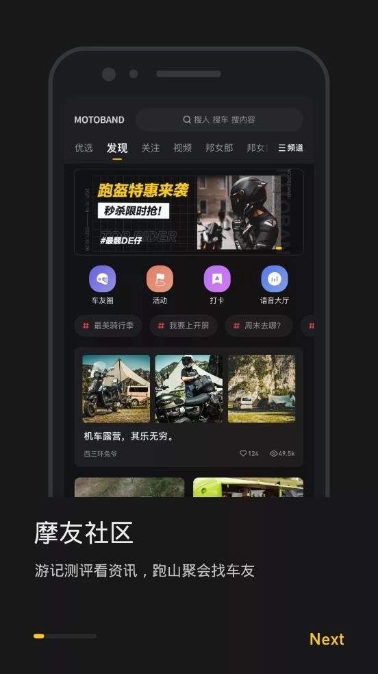 1、首先打开摩托邦,在社区模块里有不少热爱骑行的朋友,你可以认识志同道合的小伙伴,一起享受骑行的乐趣!