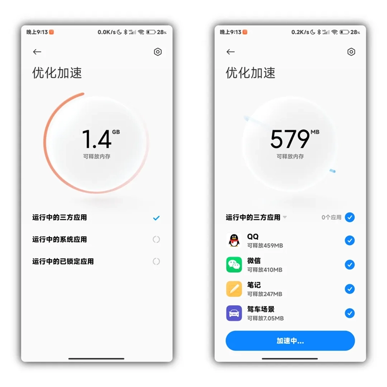 优化加速就是后台清理,但是比后台里的一键清理更加全面、干净。打开就会自动进行扫描,扫描成功后点击清理就能优化。