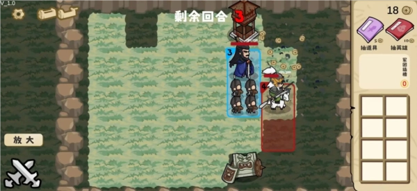 正式开始后,角色左上角的数字表示本回合的可行动次数,游戏右上角可抽取道具与英雄,下方的方块则是物品栏。