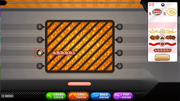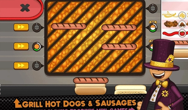 先把热狗放在烤炉上,留意左边指针的颜色,等指针变成橙色时就再次点击热狗给它翻面。(记住别让它烤焦了哦)
