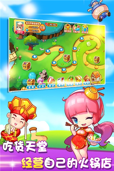 《开心火锅店》单机版是一款经营模拟类游戏,玩家将在游戏中化身火锅店老板,通过研发多元口味的锅底、提供新鲜食材,逐步将自己的火锅店发展壮大。游戏内火锅品类十分丰富,既有经典的川渝火锅、精致的日式火锅,也有创意十足的薯片火锅,只有想不到,没有研发不出的美味!游戏玩法简单易上手:满足顾客需求赚取餐费,用收益升级店铺、解锁更多火锅品类,最终扩大经营规模,成为火锅行业的领军者。此外,游戏还设置了丰富的成就系统等待玩家挑战,玩家也能自由装扮店铺,打造专属风格的火锅店。感兴趣的朋友不妨来体验一番!