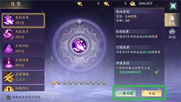 4、于技能界面处,点击一键升级,以此提升角色各方面属性。