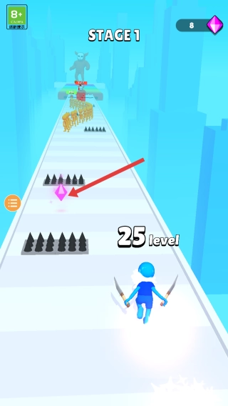 进入第一阶段,控制角色顺着路线奔跑,遇到尖刺要及时避开绕行,看到粉色水晶别忘了拾取,靠近敌人时就用双刀发起攻击。
