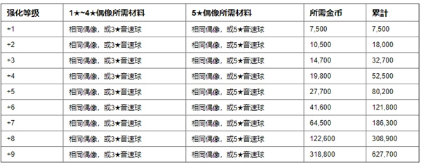 以下为偶像每强化一级所消耗的金币,数量还是非常多的,所以初期最好还是不要随便提升1~2星的偶像,除非后期收藏。