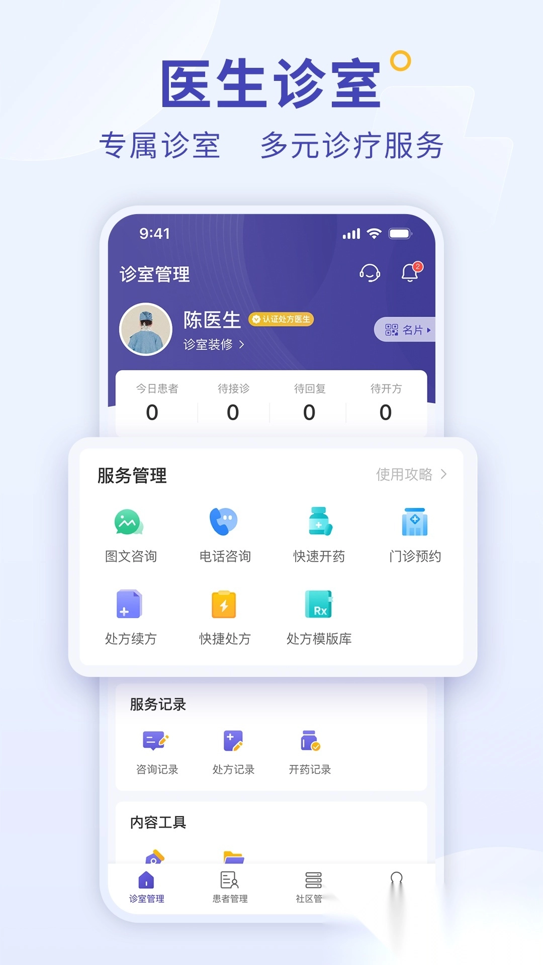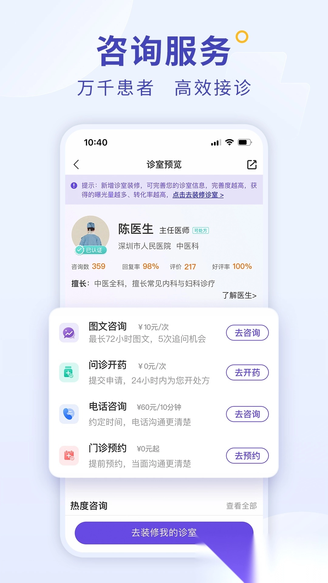 支持医生搭建线上诊疗空间,提供图文、电话等多元问诊服务。