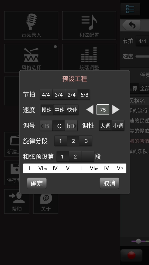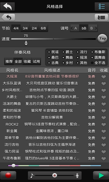 软件启动后,界面会直观呈现节拍器、调号等基础设置,还有数十种伴奏风格可以自由挑选。