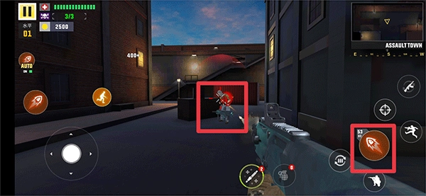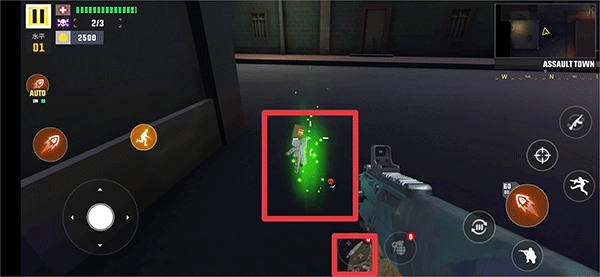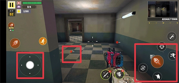 进入游戏后,左下角的轮盘用于控制角色移动,右侧则分布着换弹、射击、下蹲、跳跃等操作按钮。玩家需要根据游戏里的红色标识来定位敌人的位置。