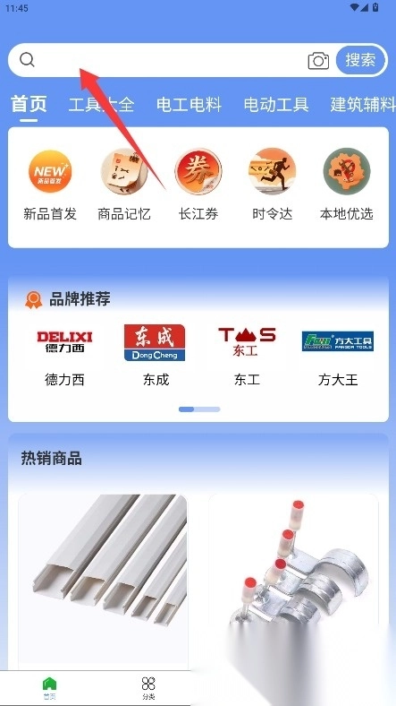 在首页顶部的搜索框中输入商品名称或相关关键词,系统会自动展示符合条件的商品列表供用户挑选。