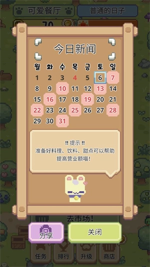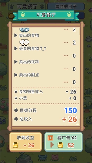 当所有菜品都售罄后,一天的营业就可以结束了,点击“取得收益”按钮就能获得金币。