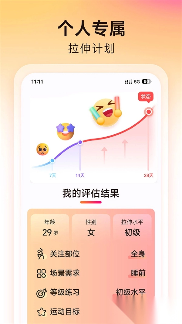 智能计划生成系统:用户输入身体数据后,系统会自动匹配对应难度等级的课程方案;同时支持自定义单次训练时长,从3分钟的快速放松到15分钟的深度拉伸,用户都能自由调整。