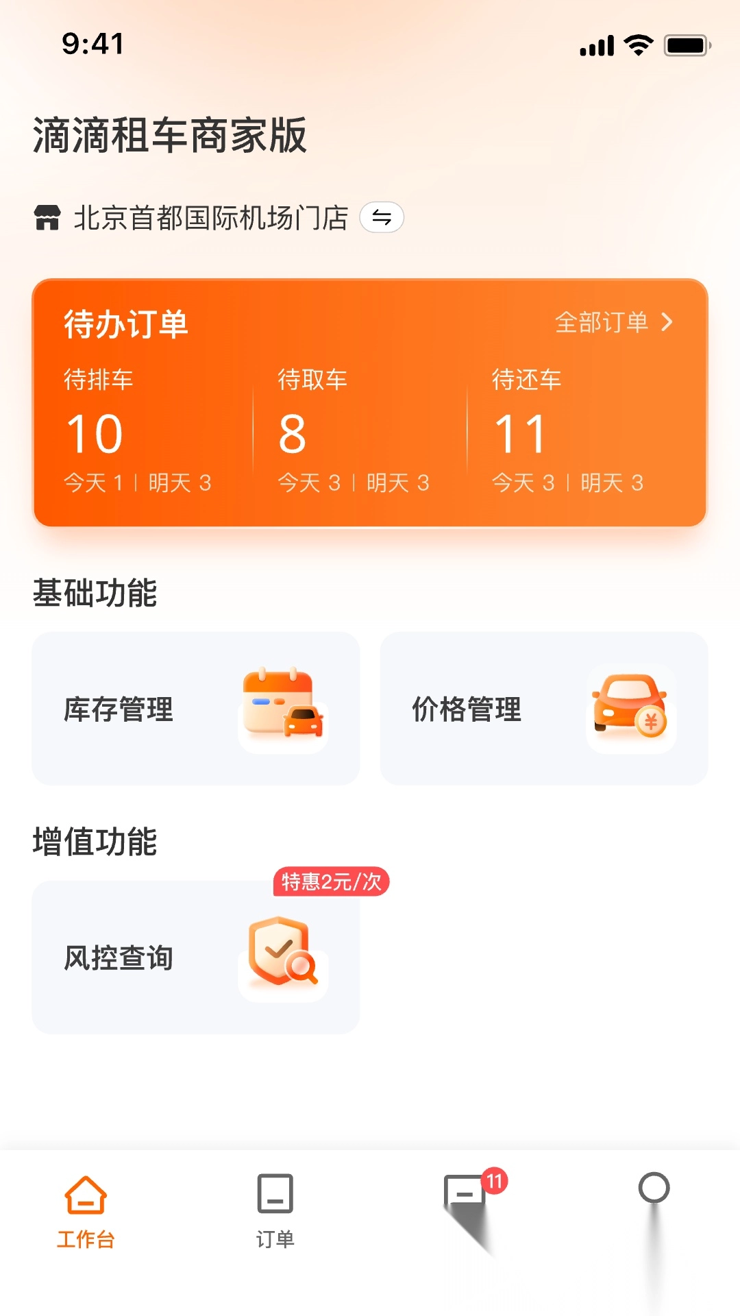 滴滴租车商家端是滴滴出行专门为汽车租赁公司开发的管理工具,主要目的是助力商家达成智能化运营。这款应用包含工作台、订单、消息和个人中心四大核心板块,功能涵盖了库存调整、价格设定、订单处理、消息推送以及风险监控等全流程环节;借助数字化方式简化传统管理模式,能明显提高工作效率并改善成本控制。界面设计简洁明了,操作流程方便顺畅,适合不同规模的租赁企业快速掌握使用;系统会不断进行更新维护,保障其稳定性和安全性。有兴趣的用户可以直接体验最新版本。
