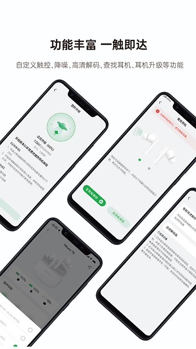 自定义触控、降噪、高清解码、耳机搜索、耳机升级等功能。