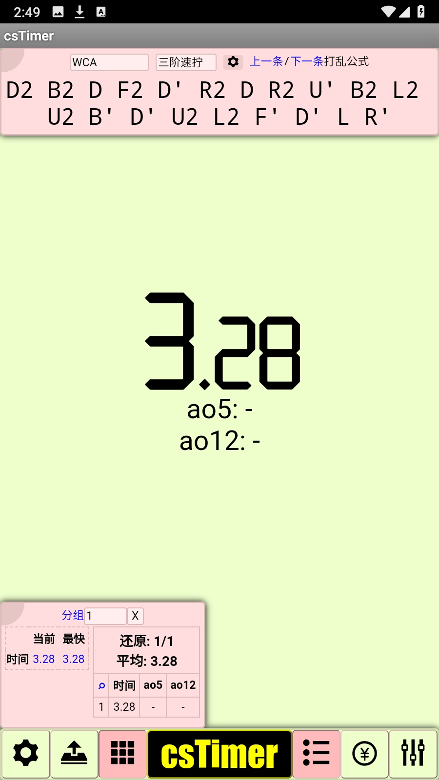 成绩列表面板-在该面板中,你能够点击“分组”按钮进入分组管理界面,进行分组的选择、添加、删除以及清空操作。同时,还可以查看当前的单次成绩、平均成绩,最快的单次成绩、最快的平均成绩,以及完整的成绩列表。
