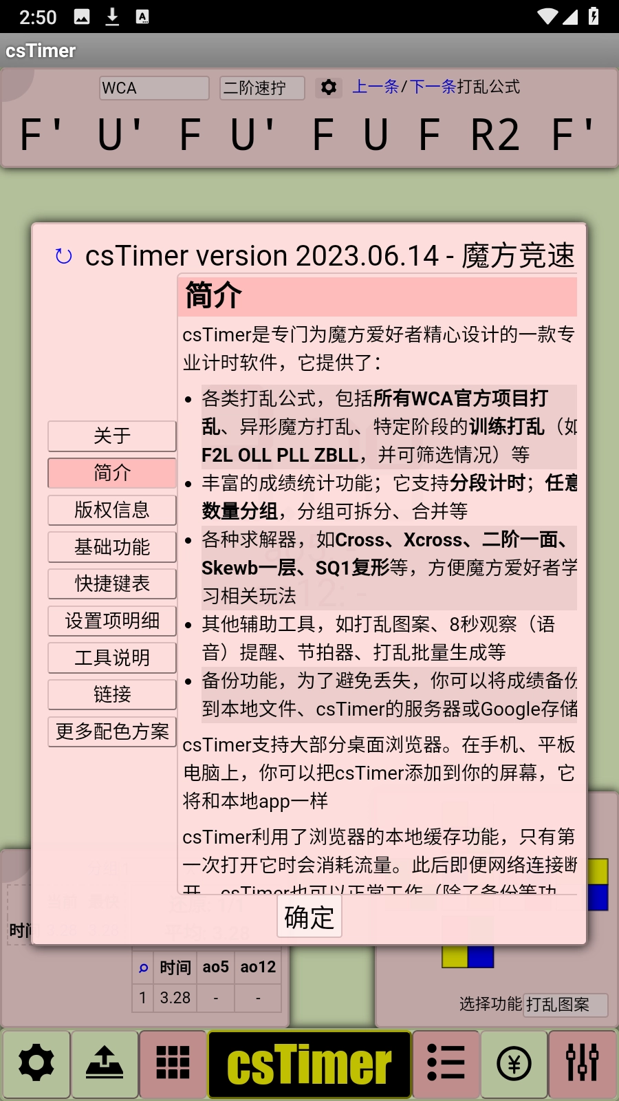 在Logo区域的提示信息:csTimer的Logo可作为信息展示面板,用于呈现各类你或许关心的内容,例如打破个人最佳成绩(PB)等情况。