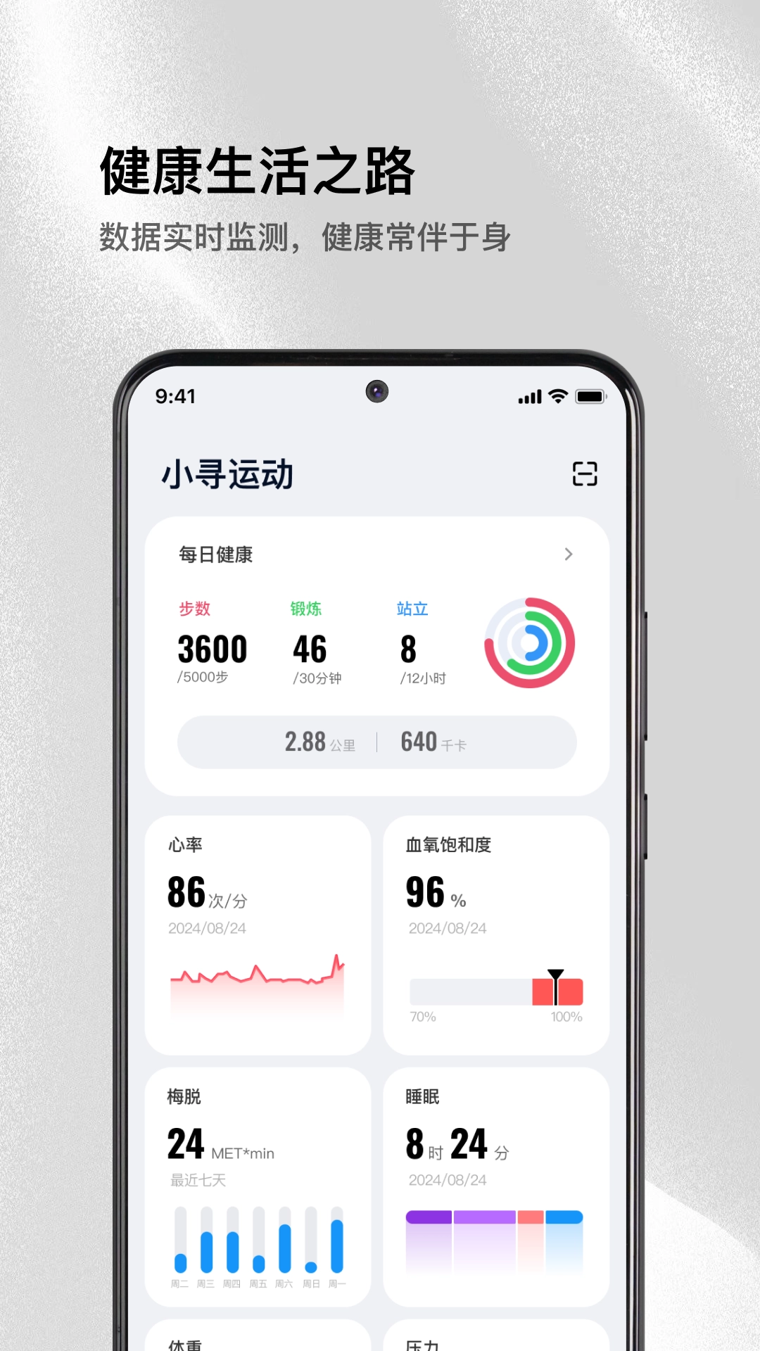 小寻运动手表作为配套的健康管理软件,能让用户随时查看智能手表监测的健康数据,像血氧、心率、血压等指标都能清晰呈现,帮助用户全面了解自身健康状况,为健康生活提供有力支持。而最新版本的小寻运动还具备运动数据统计功能,智能手表记录的游泳、跑步、骑行等各类运动信息,会被自动分析计算出运动消耗、时长和轨迹等内容,让用户掌握详细的运动资料,从而开启科学健康的运动模式,助力身体更健康。