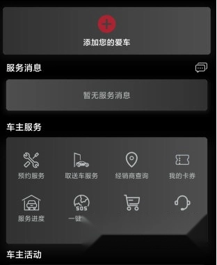 点击爱车进入该页面后,查看提供的服务消息、车主服务和车主活动