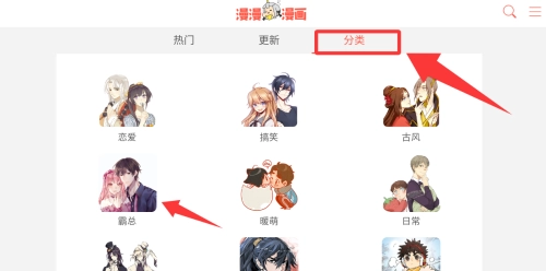 点击红色框内的分类,里面有很多不同题材,选择“霸总”分类进入查看。
