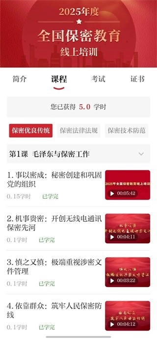 进入系统后,点击“课程”即可开启学习。课程涵盖保密优良传统、保密法律法规、保密技术防范以及保密警示案例四个部分,主要采用视频和音频形式呈现。在学习页面能够随时查看已积累的学时。