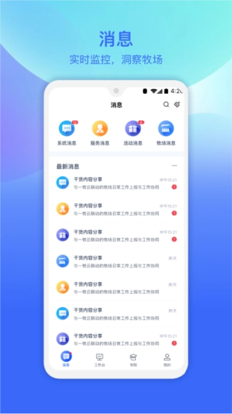 一站式服务:整合应用、消息与学院功能,覆盖应用集成、消息预警、产品学习及行业智库,全方位满足牧场各类需求。