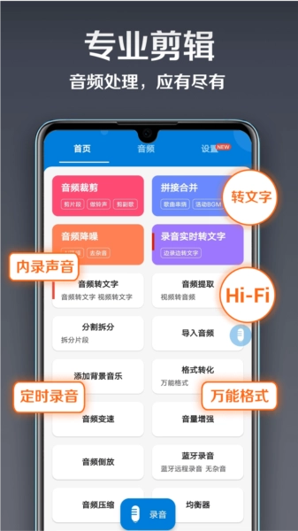 录音达人配备了多样的音频编辑工具,像音频裁剪、拼接合并、音频降噪、智能变声、快速配音(文字转音频)、音频提取、格式转化等,可满足用户多元化的音频处理需求。