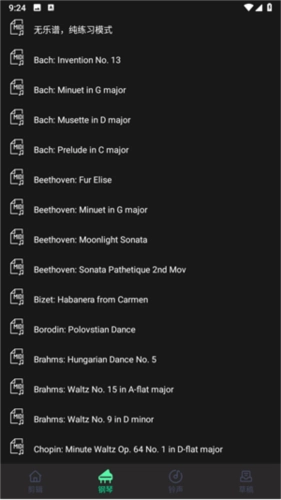进入钢琴页面,里面支持丰富的乐谱练习。