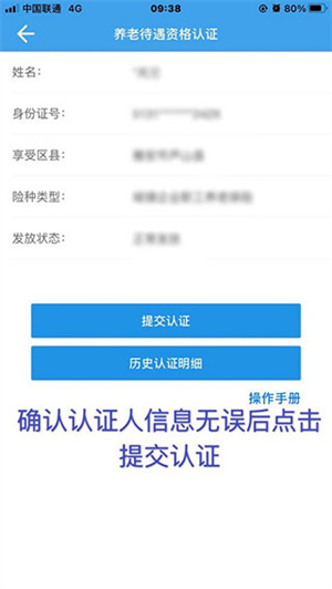7、“本人认证”即进入养老待遇资格认证界面/“替他人认证”需填写他人身份证号后进入养老待遇资格认证界面,确认信息无误后点击“提交认证”