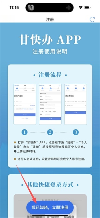 4、在注册说明页面,点击我已知晓立即注册按钮,进入注册方式选择页面。