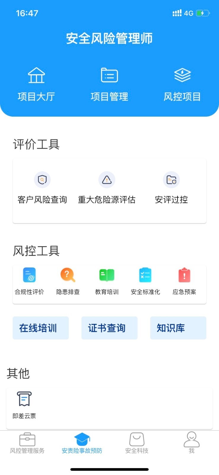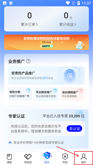 在应用首页,用户可以查看【累计订单】和【累计收益】,参与【安责险产品推广】等业务,还能申请【专家认证】以增加服务机会。