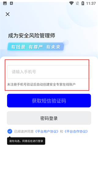 3、登录环节需填写【手机号】,若该号码尚未注册,验证通过后系统将自动生成账户;操作时请先勾选同意相关协议,再点击【获取短信验证码】完成验证步骤。