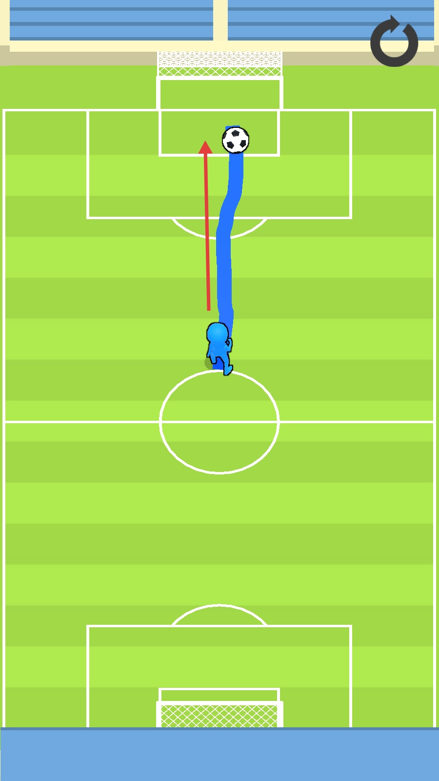 1. 我们先绘制出蓝色线条,以此来规划足球的运动路径,使得足球能够顺着红线所指的方向朝着球门射去,努力尝试完成进球。