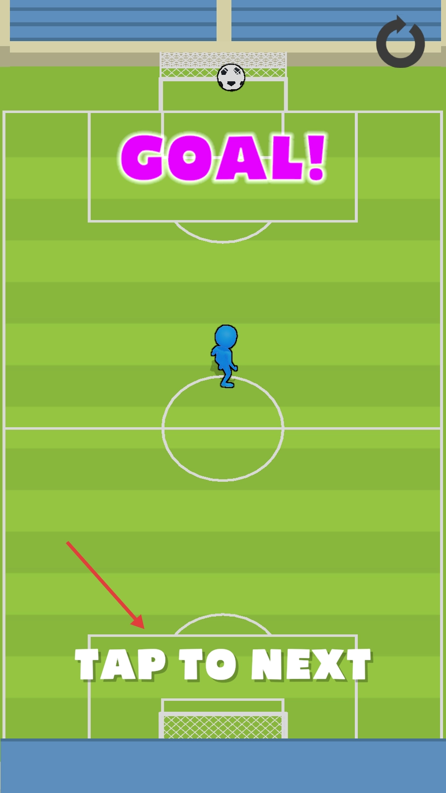2. 当成功进球后,画面会出现【GOAL】,这意味着你已经掌握基础玩法啦。现在,点击即可进入下一关,挑战全新内容哟。