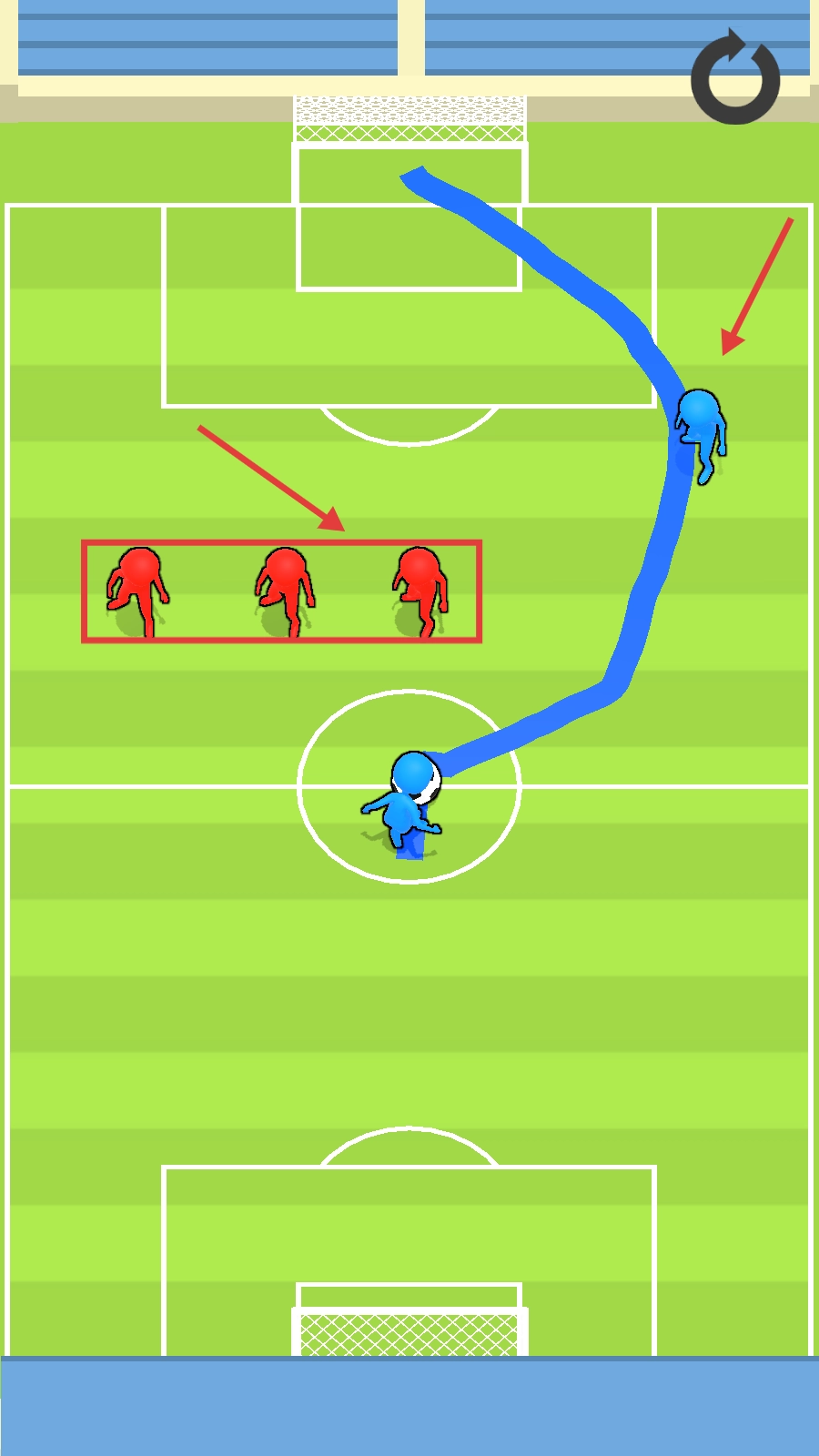 3、当遭遇红色防守球员时,绘制线条过程中要巧妙地绕开他们,使球躲开拦截,持续朝着球门方向推进。
