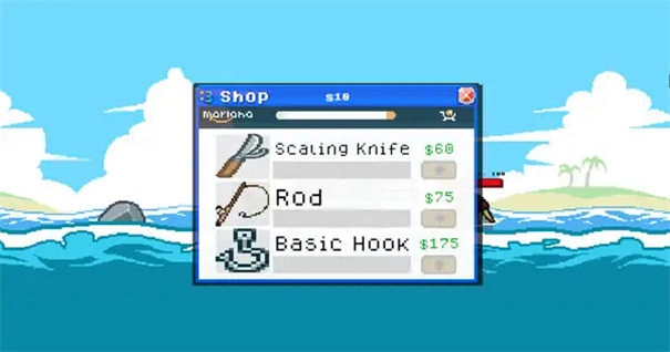 6、点击右上角的$按钮,即可进入商店,在商店里能够用金币对钓鱼等工具进行升级。