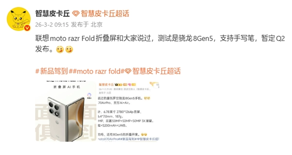 根据爆料,moto razr fold的国行版本计划于2026年第二季度正式推出,而海外版将先在欧洲市场上市,搭配moto pen ultra手写笔的套装售价为1999欧元,约合人民币1.6万元。