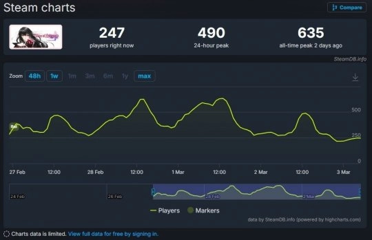 万代南梦宫推出的《狂战传说》高清复刻版在PC平台开局遇冷。数据显示,这款2016年的经典JRPG更新版本,在Steam平台首发时的同时在线玩家峰值仅635人,截至目前已降至250人左右,和原版当年近8000人的在线峰值相比差距明显。