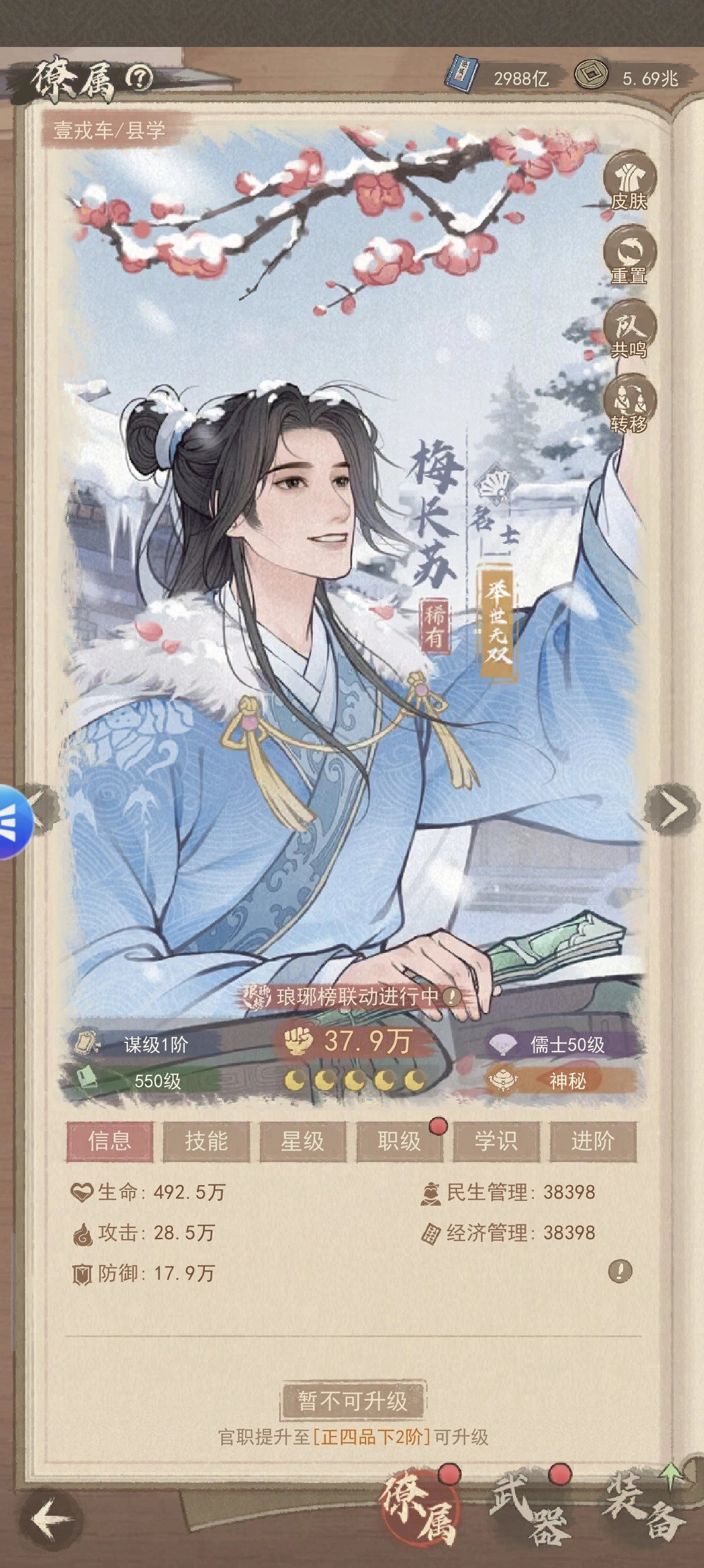 2、后期重点拉满核心技能:必杀技【夜影拂香】、被动【绛雪回春】至6星,星级技【暗香疏影】也点满至6星,兵种技能升至5星。