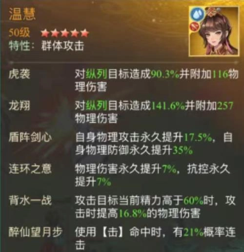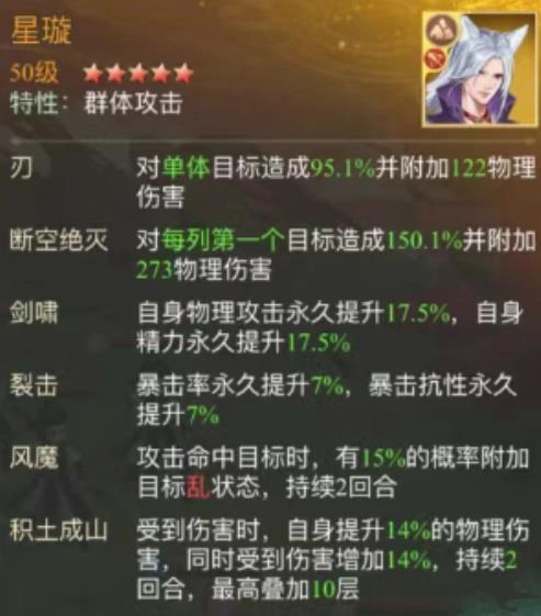 4、4号位安排温慧,她能独自承担一列敌人的输出,凭借连击与暴击效果,大概率可以直接击溃一整列对手;若能存活至战斗后期,还能进一步提升我方整体输出能力。6号位选用云天河,他的普攻与绝技伤害都较为可观,同时暴击概率较高,更容易打出高额伤害,而且绝技还附带定身效果。9号位搭配沈欺霜,她的单体输出伤害极高,有景天在前承担伤害,无需担心生存问题,专注输出即可。