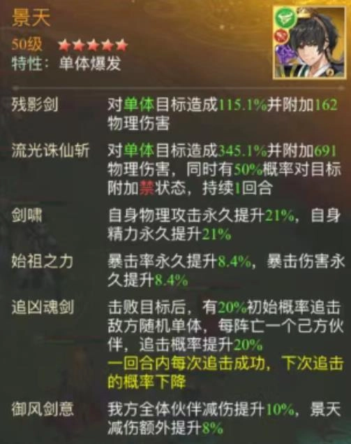 2、星璇必须在前两回合乱到飞蓬至少一次且飞蓬一次不打星璇,虽然有景天增加减伤,但飞蓬伤害高,保证第二回合星璇存活概率。景天绝技追击把清除小怪,保证我方不减员,全员多暴击连击。