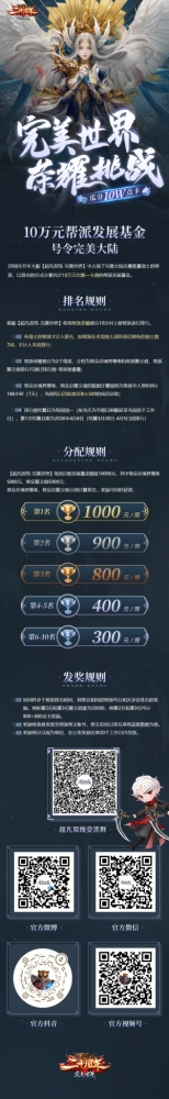 为了迎接每一位心怀荣耀的帮主与兄弟,超凡新服“完美世界”推出“10万元帮派发展基金计划”,助力各大帮派征战完美大陆,共享荣耀与财富!在新服中占领领土的帮派,将根据每周帮派荣耀值进行排行,瓜分总计10万元完美一卡通,让你的帮派发展如虎添翼!
