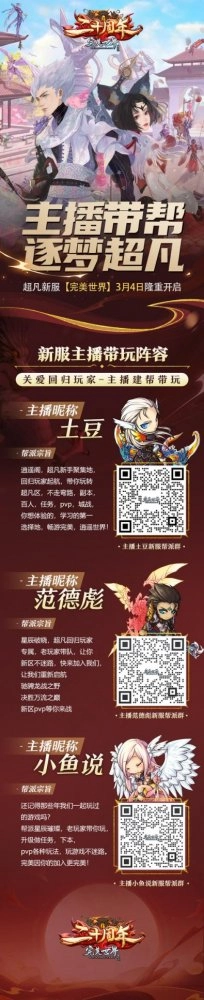 随着超凡新服“完美世界”的开放,多位官方抖音主播今日已入驻新服,欢迎你选择喜欢的主播,加入到他们的帮派之中。对于回归的修行者,这里有一群和你一样的老友,边玩边聊当年的故事。而刚入坑的新朋友,这里有问必答,不会让你一个人摸索着走弯路。