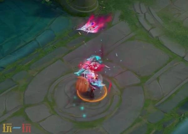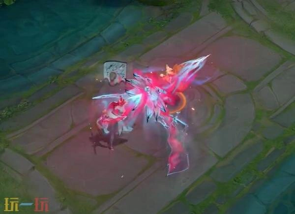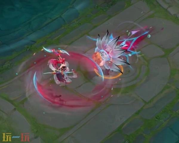 一技能:刃锋割裂虚实,探出妖异莲花,同时,长卷自陷裂的地面上升起。随即刃尖穿透莲花贯入异界,又从异界杀出袭向目标。
