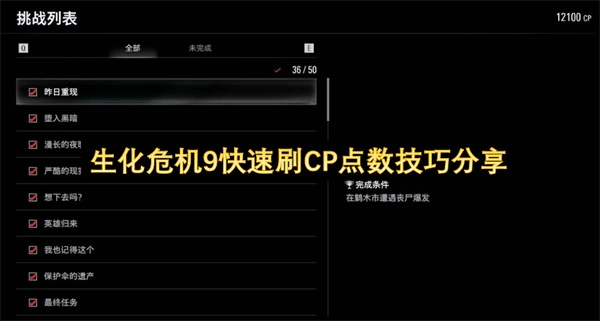 ※挑战的完成状况所有存档共通,每项挑战只能完成一次,已经完成的挑战无法在其他存档中重复完成。也就是说,完成同一个挑战只能获得一次CP点数,重复完成不会再获得CP点数。但是,累计类的挑战可以通过反复存读档来累积。