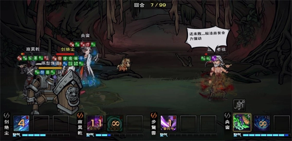 4、具体打法为在第二回合结束之前,把血魔老祖打到二阶段,也就是他说合道而已的时候(2回合之内打掉老祖30%血进入第二阶段把小怪吃掉),不然第三回合的话会吸收小兵身上的血,强化血傀,血傀储存的血越高,第三阶段开局的血量会越高,难以当回合压出换血机制。