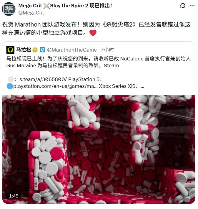 在社交媒体上,《杀戮尖塔》的开发团队Mega Crit发文,先是祝贺《马拉松》的漫长等待终于迎来发售,但结尾却不忘对这款大作狠狠地补了一刀。他们表示:“别因为《杀戮尖塔2》发售了,就错过了像这样用心的小众独立项目。”