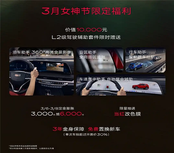 从即日起至3月8日,在此期间下单的用户能够享受三项限时福利,具体包含:限时获赠价值10000元的L2级辅助驾驶包、支付3000元定金可抵扣6000元购车款的定金膨胀优惠,以及在直播间参与限时抽奖赢取热门改色车衣。
