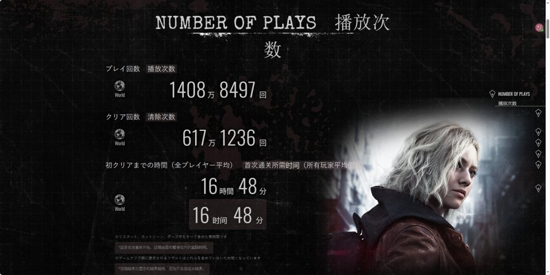 统计页面的数据显示,到目前为止,全球玩家的累计游玩次数已达到1411万7223次,通关次数为619万5028次,玩家首次通关的平均时长是16小时48分钟。