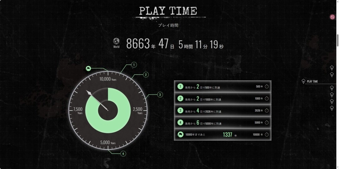 更为惊人的是累计总游玩时长:已达8663年又47天5小时11分钟19秒。里程碑追踪显示,发售后仅2天累计时长突破500年,同样在第2天突破1000年;发售第4天,总时长达到2026年,与当年年份重合;发售第6天,时长突破5000年。目前,距离“总游玩时间达一万年”的里程碑仅剩约1337年——以当前增速计算,这一纪录有望在数日内被打破。